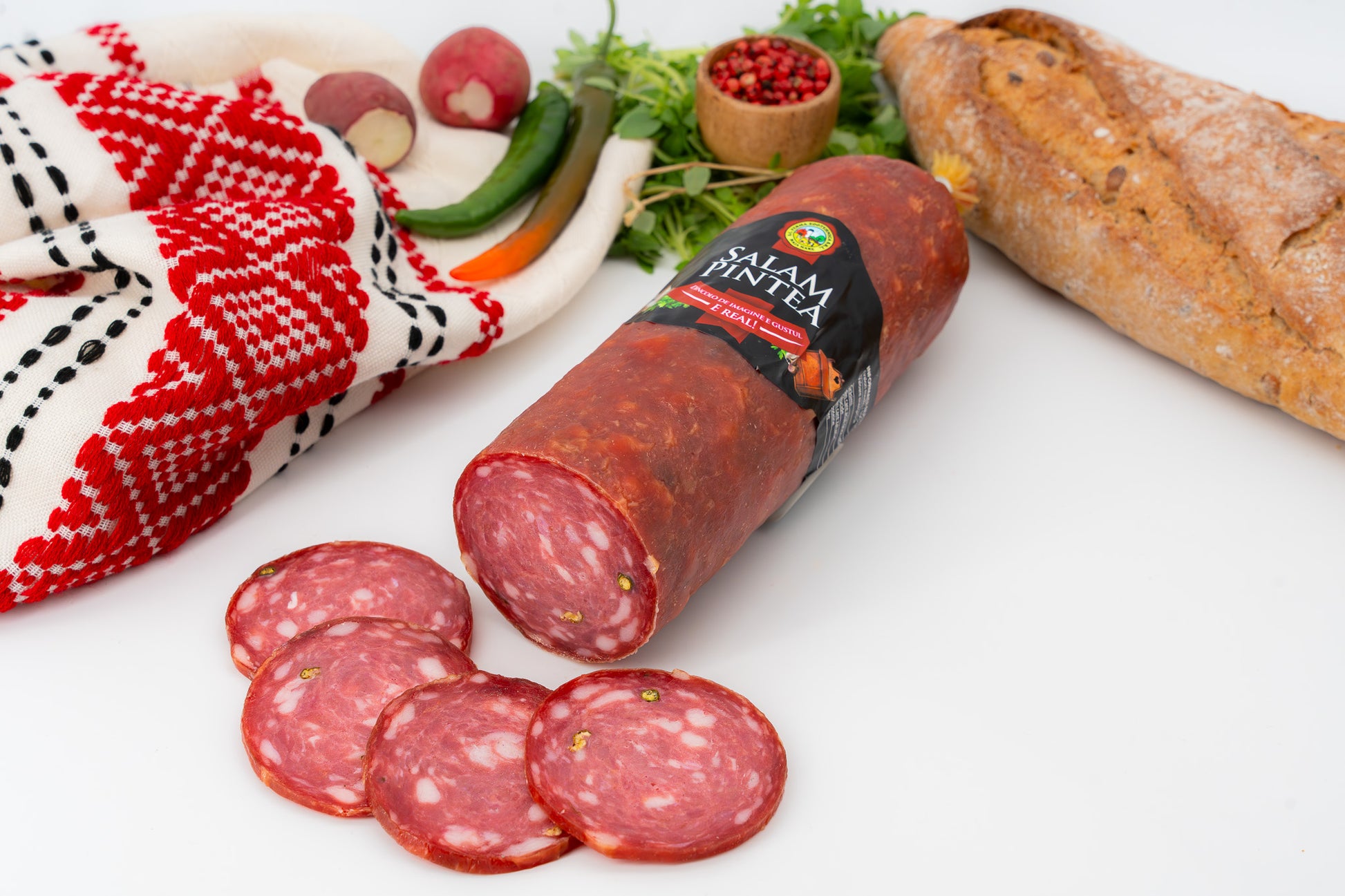Carne de porc (95,4%) (din UE), sare, condimente, extract de condimente, boabe de piper verde, arome naturale: preparate aromatice; antioxidant: acid ascorbic; zaharuri: zaharoza, dextroza; colorant: carmin; intaritor de gust: monoglutamat de sodiu; conservanti: nitrit de sodiu, nitrat de sodiu si potasiu; cultura starter.  Produsul poate contine urme de: soia, lapte, lactoza, telina, mustar, gluten.