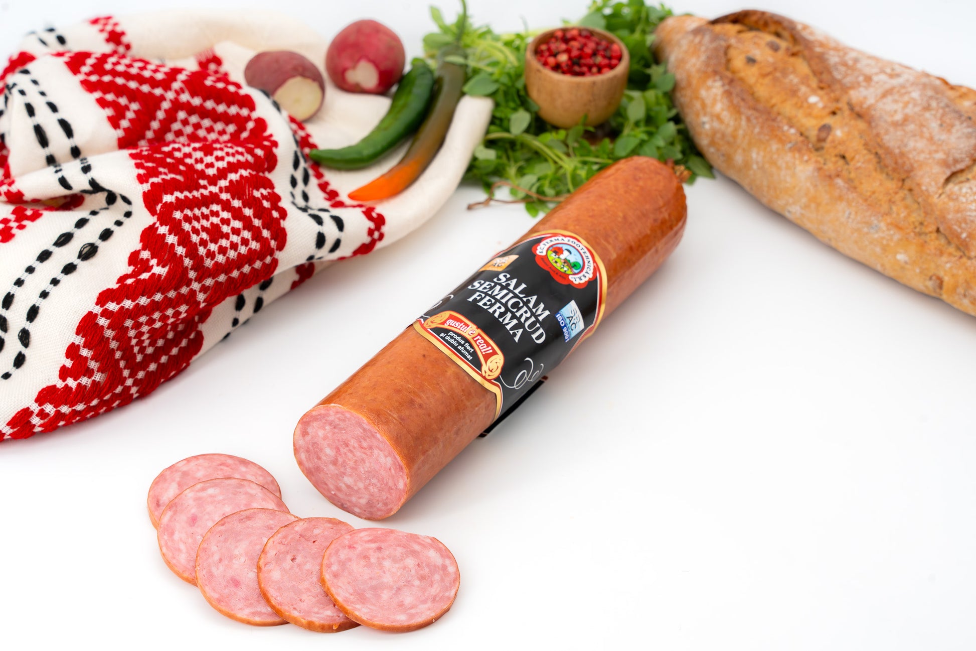Salamul semicrud Ferma este un mezel tradițional, preparat din carne de porc de calitate superioară, condimentat cu mirodenii naturale și uscat într-un proces controlat, păstrând o textură fermă și un gust intens. Ideal pentru platouri, sandvișuri sau gustări, acest salam oferă o savoare autentică și rustică, perfectă pentru iubitorii de mezeluri de calitate.