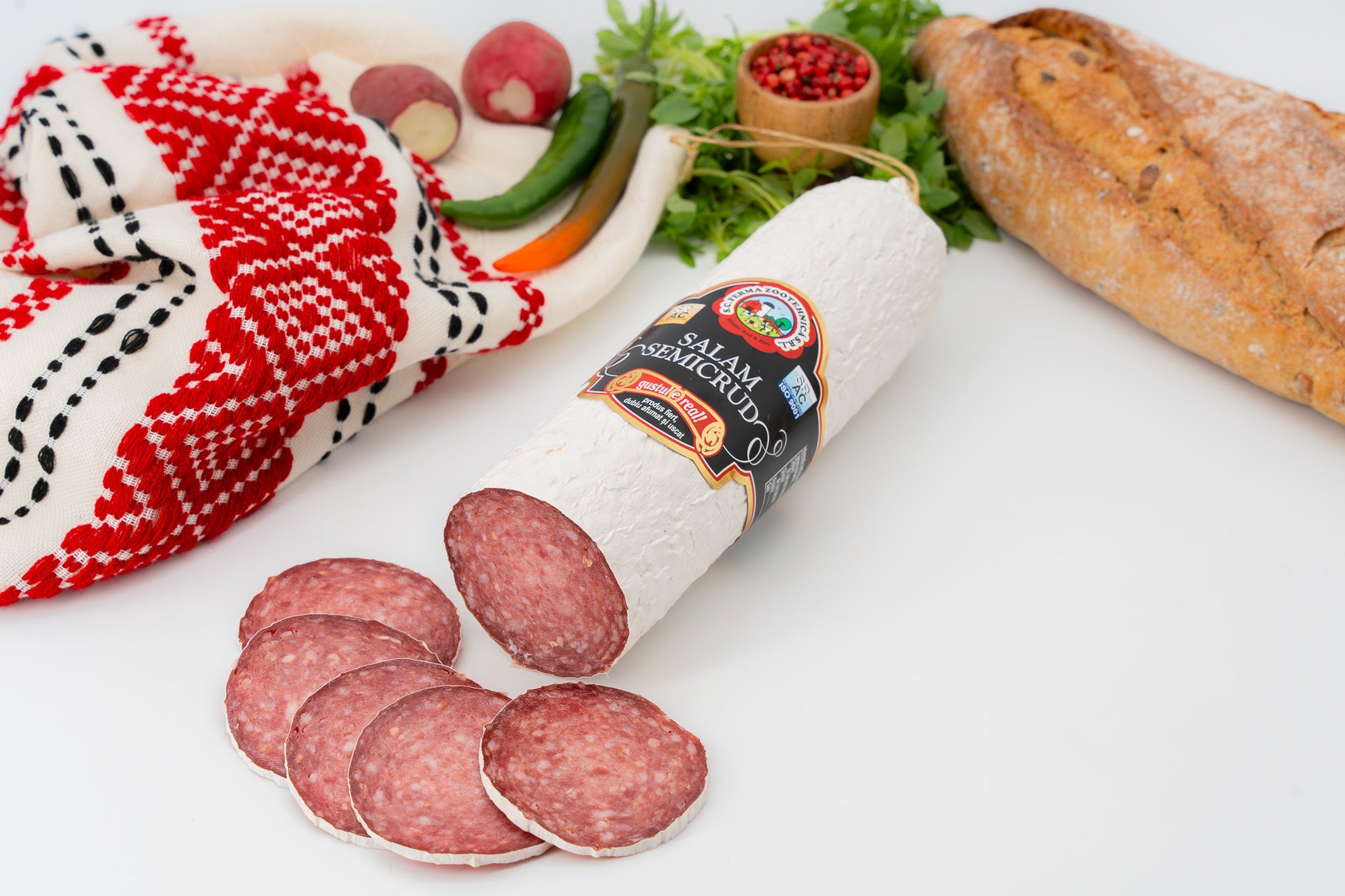 Salamul semicrud este un mezel preparat din carne de porc, condimentat cu mirodenii tradiționale și uscat la o temperatură controlată, păstrând o textură fermă și un gust intens. Acest salam adaugă un plus de savoare platourilor, sandvișurilor sau gustărilor, fiind o alegere perfectă pentru iubitorii de mezeluri autentice și delicioase.
