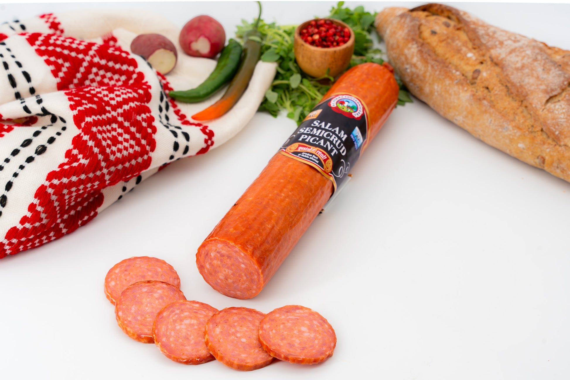 Salamul semicrud picant este un mezel preparat din carne de porc, condimentat cu mirodenii iuți și uscat natural pentru a-i oferi un gust intens și o aromă deosebită. Cu o textură fermă și un gust picant echilibrat, acest salam este ideal pentru platouri de mezeluri, sandvișuri sau gustări, aducând o notă de picant în fiecare mușcătură.